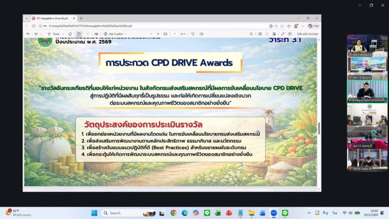 วันที่ 19 กุมภาพันธ์ 2569 นายนที สะอาดนัก ผู้อำนวยการศูนย์ถ่ายทอดเทคโนโลยีการสหกรณ์ที่ 15 จังหวัดเพชรบุรี และทีมงาน เข้าร่วมประชุมการขับเคลื่อนนโยบายของกรมส่งเสริมสหกรณ์ ปีงบประมาณ พ.ศ. 2569 (CPD Drive & CPD Sandbox) โดยมีนายอนุรัตน์ เลื่อนลอย ผู้อำนวยการสำนักพัฒนาและถ่ายทอดเทคโนโลยีการสหกรณ์เป็นประธาน ผ่านระบบประชุมทางไกลออนไลน์ Zoom Meeting ณ ห้องประชุม ฝ. 101 ชั้น 1 อาคารฝึกอบรมส่วนกลาง สำนักพัฒนาและถ่ายทอดเทคโนโลยีการสหกรณ์ เขตดุสิต กรุงเทพมหานคร