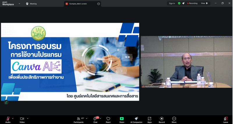 วันที่ 26 มีนาคม 2569 นายภักดี จันทร์เกษ รองอธิบดีกรมส่งเสริมสหกรณ์ เป็นประธานในพิธีเปิด การบรรยายความรู้เกี่ยวกับ “การใช้งานโปรแกรม Canva AI เพื่อเพิ่มประสิทธิภาพการทำงาน” โดยมีวัตถุประสงค์เพื่อให้บุคลากรของกรมส่งเสริมสหกรณ์มีความรู้ ความเข้าใจในการใช้งานโปรแกรม Canva AI เพื่อเพิ่มประสิทธิภาพในการทำงาน และให้เป็นไปตามแผนการปฏิบัติการด้านการพัฒนาทรัพยากรบุคคลประจำปีงบประมาณ พ.ศ. 2569 กรมส่งเสริมสหกรณ์ โดยนายนที สะอาดนัก ผู้อำนวยการศูนย์ถ่ายทอดเทคโนโลยีการสหกรณ์ที่ 15 จังหวัดเพชรบุรี มอบหมายข้าราชการและพนักงานราชการ เข้าร่วมรับฟังการบรรยายผ่านระบบ Zoom Meeting